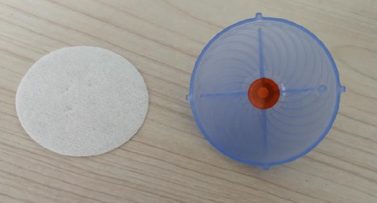 本項目共完成6個零件的自動裝配,其中有2個注塑件上傘蓋下傘蓋,一PVC片直徑11.5mm厚0.9mm名稱分流片,一直徑40mm無紡布片名稱濕化體,一段導(dǎo)水殼一段導(dǎo)水芯。自動裝配過程:轉(zhuǎn)盤式多工位方式,涉及到兩個塑料料扣合,導(dǎo)水芯導(dǎo)水殼插裝,濕化體模切后自動就位。